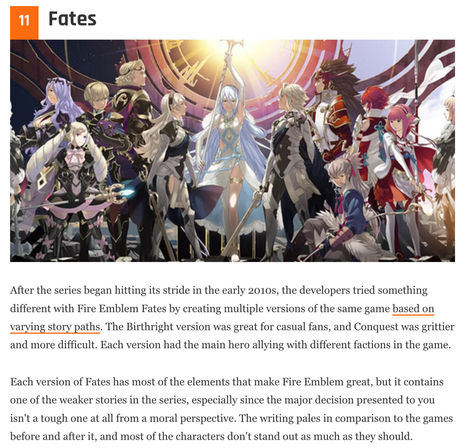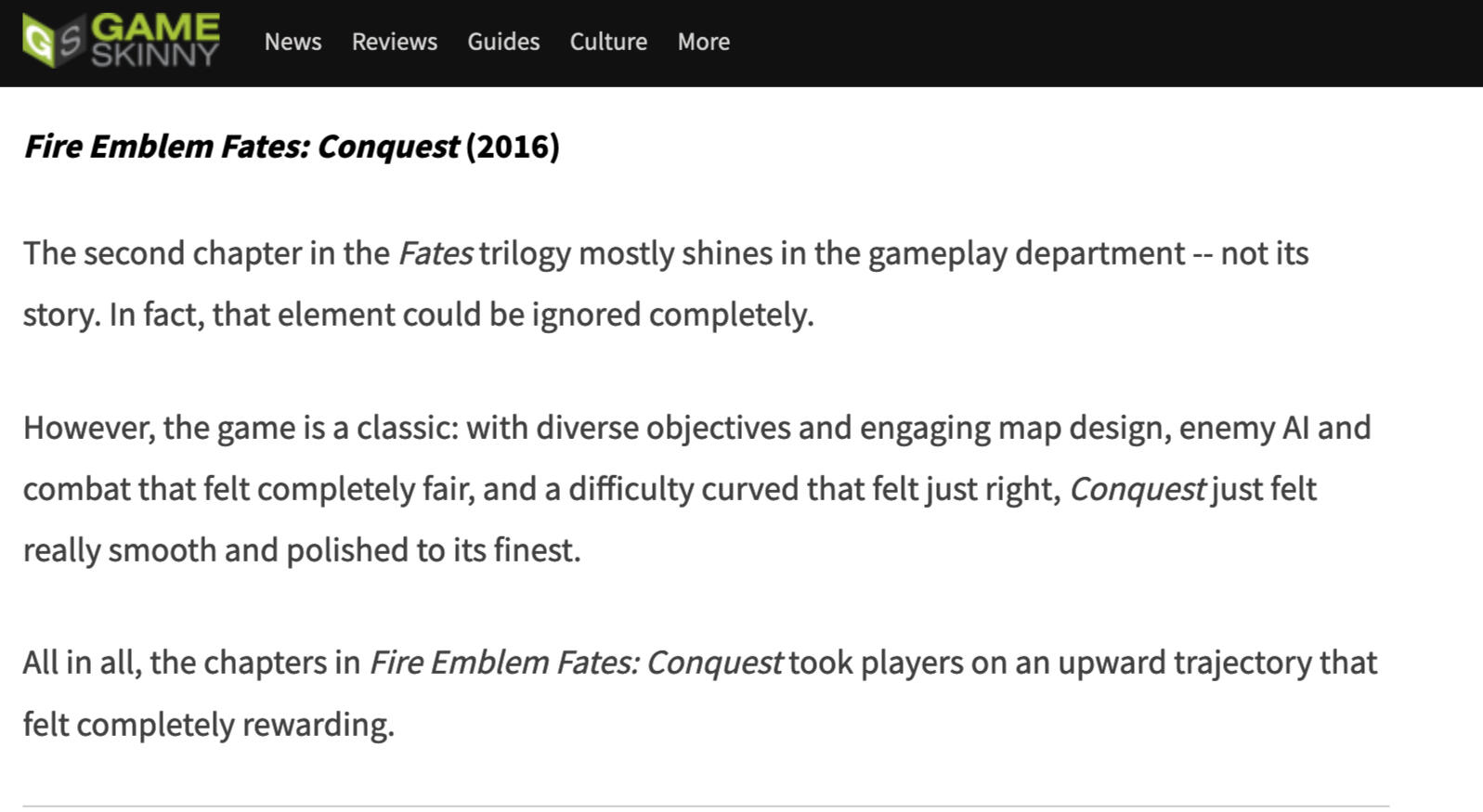Though the games were praised upon first release, in the modern day they are put under more scrutiny. Gameplay-wise they are considered some of the best, introducing dynamic systems which the series still uses to this day. But the story is widely considered to be one of the weakest in the franchise, some suggesting it could be ignored completely.Its core "blood family vs adoptive family" concept was strong, as a product of mismanaged development (the development team were essentially tasked to make three different games in the span of a single development cycle), they could not follow through with the themes they introduced. This results in the story of Fire Emblem Fates feeling shallow at best, and frustrating at worst.
